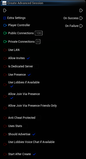 Creates a session with the default online subsystem with advanced optional inputs, for dedicated servers leave UsePresence as false and set IsDedicatedServer to true. Dedicated servers don't use presence.